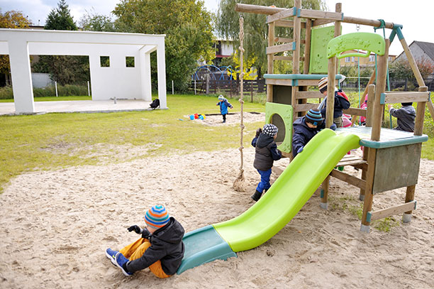 Wyjątkowa jest też lokalizacja – przedszkole jest położone trochę na uboczu w zacisznym miejscu w otoczeniu bardzo dużego, wypełnionego zielenią ogrodu.